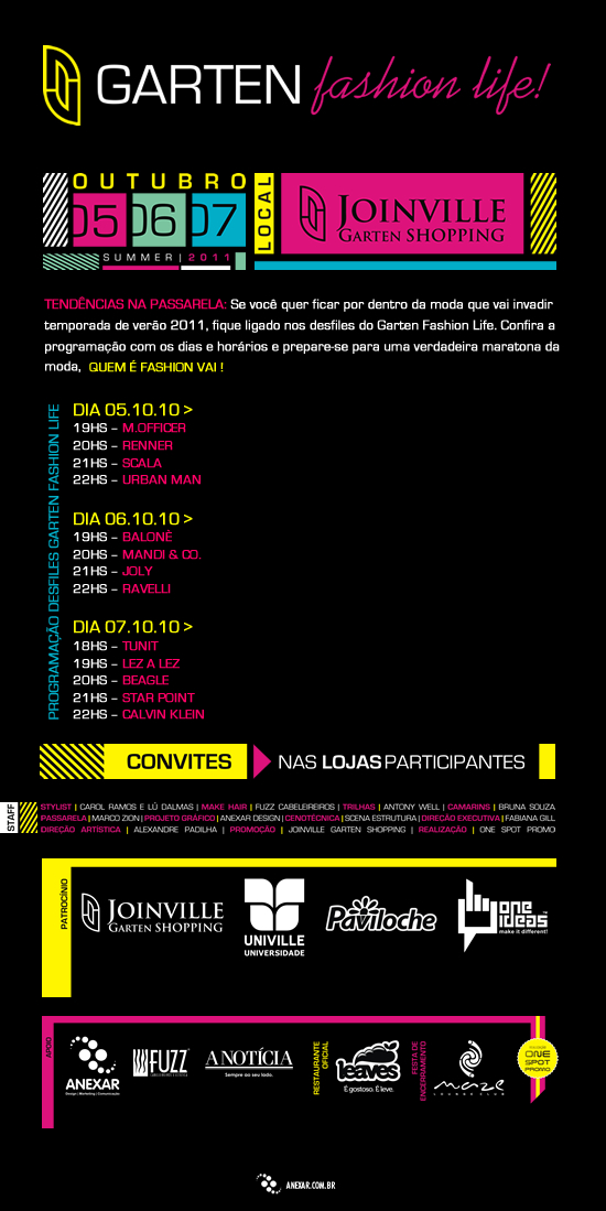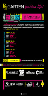 A maior cidade de Santa Catarina estará com a cara do Verão 2011 no Garten Fashion Life, que ocorrerá de 5 a 7 de outubro no Joinville Garten Shopping. O evento de moda nasce para colocar o Norte do Estado como referência no calendário da moda. Uma oportunidade para conhecer o que de melhor está sendo preparado por grifes nacionais e internacionais para a próxima estação. Entre as 13 marcas presentes no desfile estão nomes como Calvin Klein, Beagle, Lez a Lez, Mandi&Co. e M.Officer.