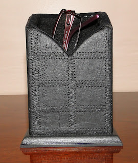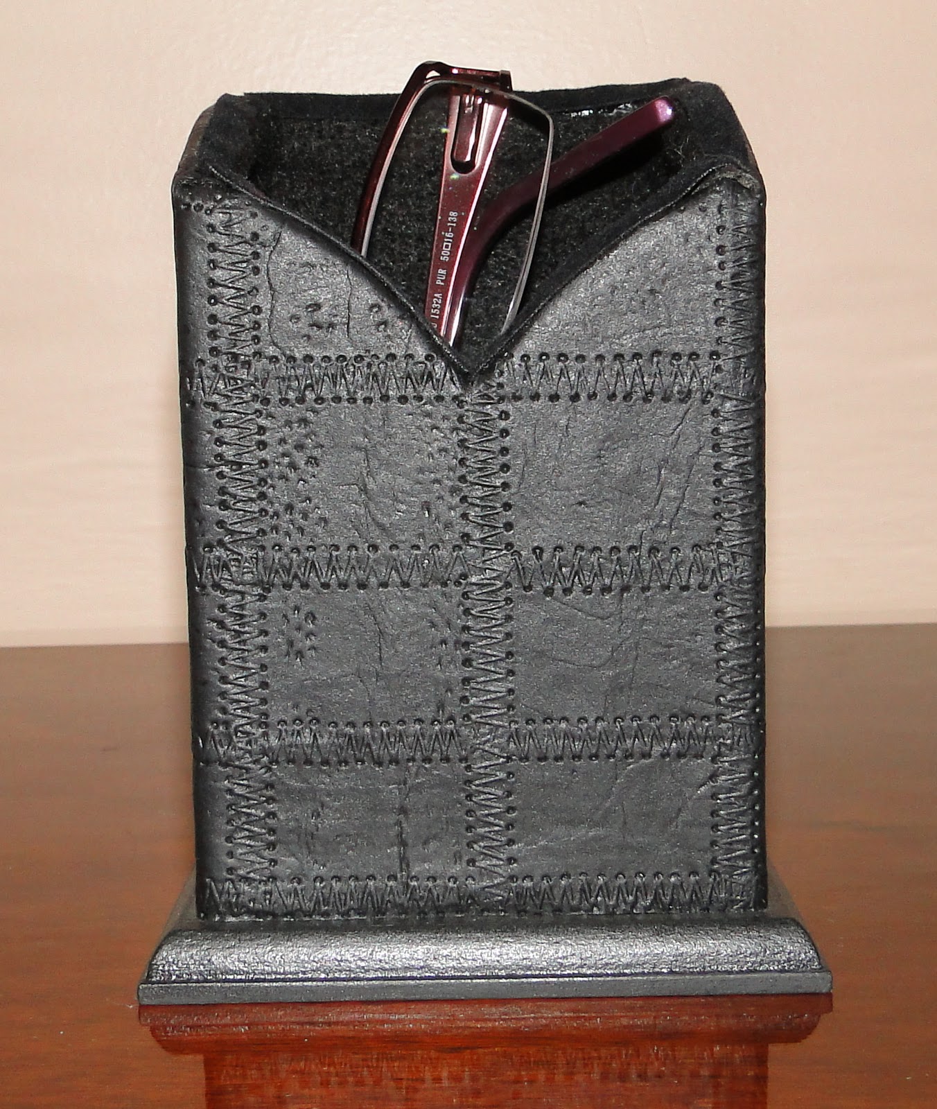 Ele é de madeira, coberto com couro na parte externa e todo forrado com pelúcia internamente, portanto não arranha as lentes do óculos, e tem ainda a opção com relógio, para os mais perdidos no tempo, hehehehehe!