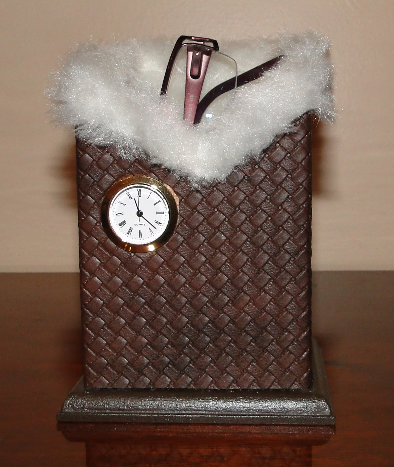 Ele é de madeira, coberto com couro na parte externa e todo forrado com pelúcia internamente, portanto não arranha as lentes do óculos, e tem ainda a opção com relógio, para os mais perdidos no tempo, hehehehehe!
